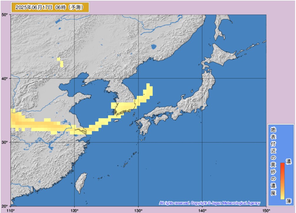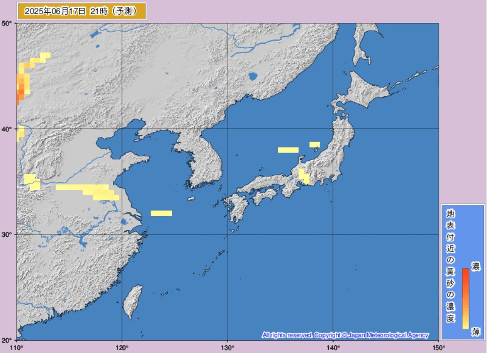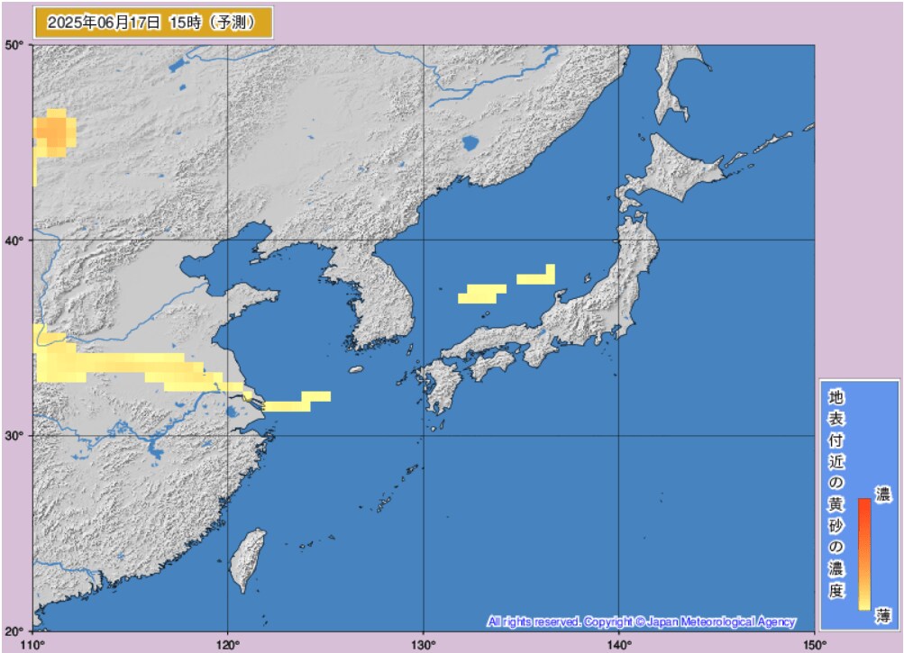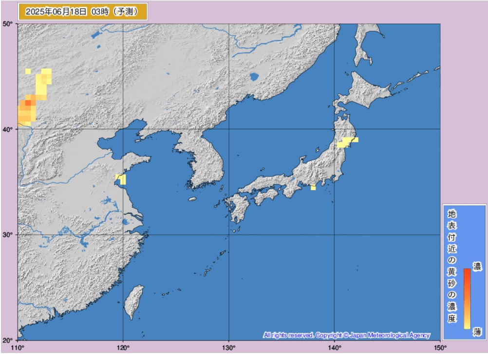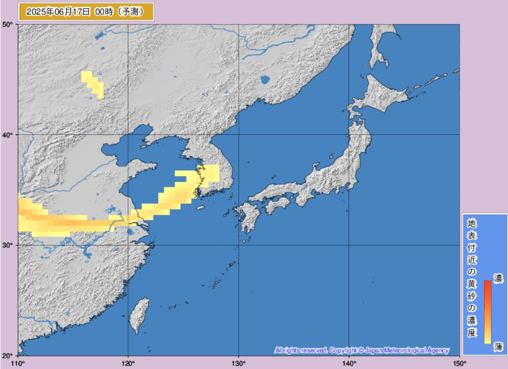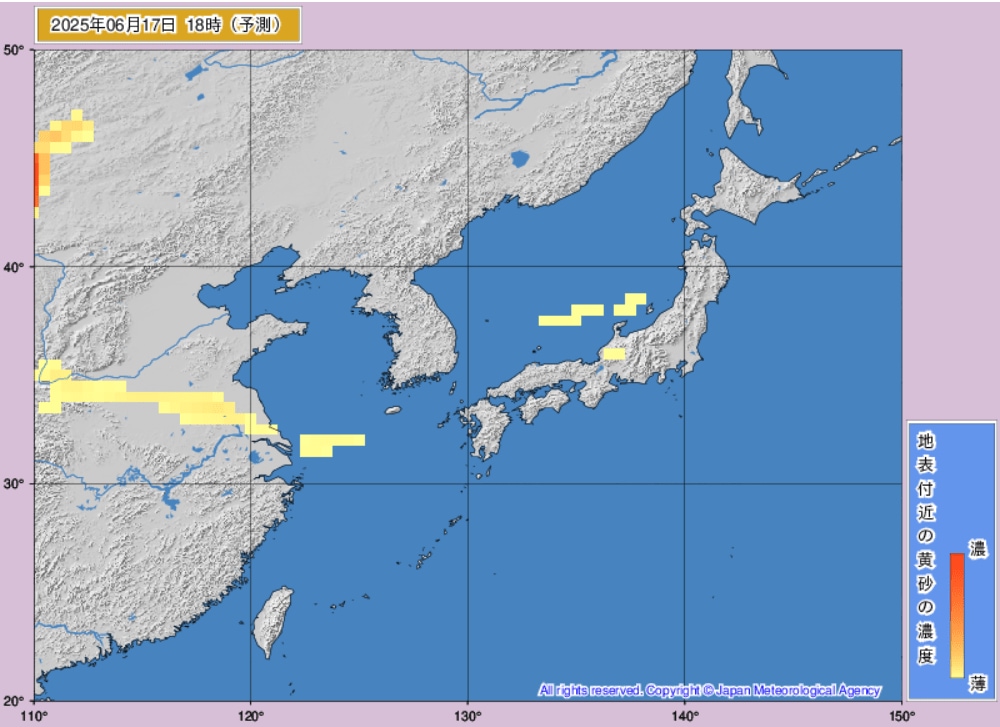 17日から18日にかけて、日本(東海地方、東北地方など)に黄砂が飛来するものとみられます。