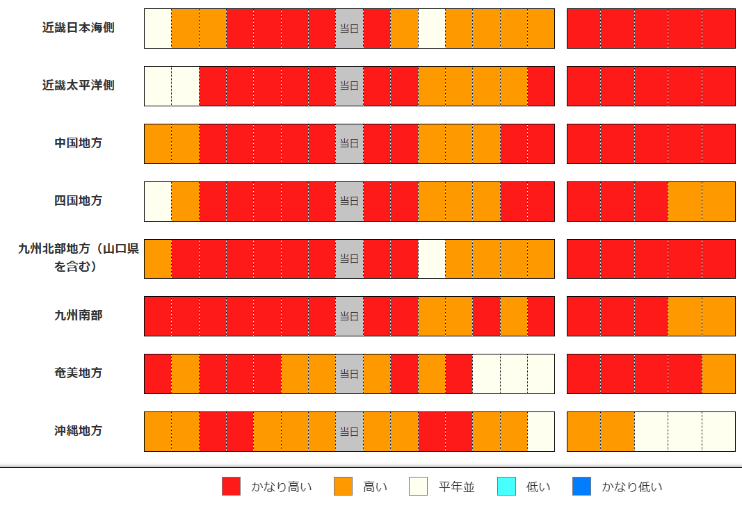 ・かなり高い(かなり低い)は、かなり高い(かなり低い)気温となる確率が30%以上のときに表示します。
