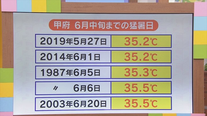 これは甲府の6月中旬までの35℃以上の猛暑日となった回数を表しています。