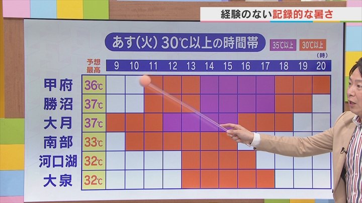 甲府や勝沼も午後2時からの4時間は35℃以上と大変厳しい暑さとなりますので、なるべくこの時間帯の外出は避けていただいた方が良いと思います。