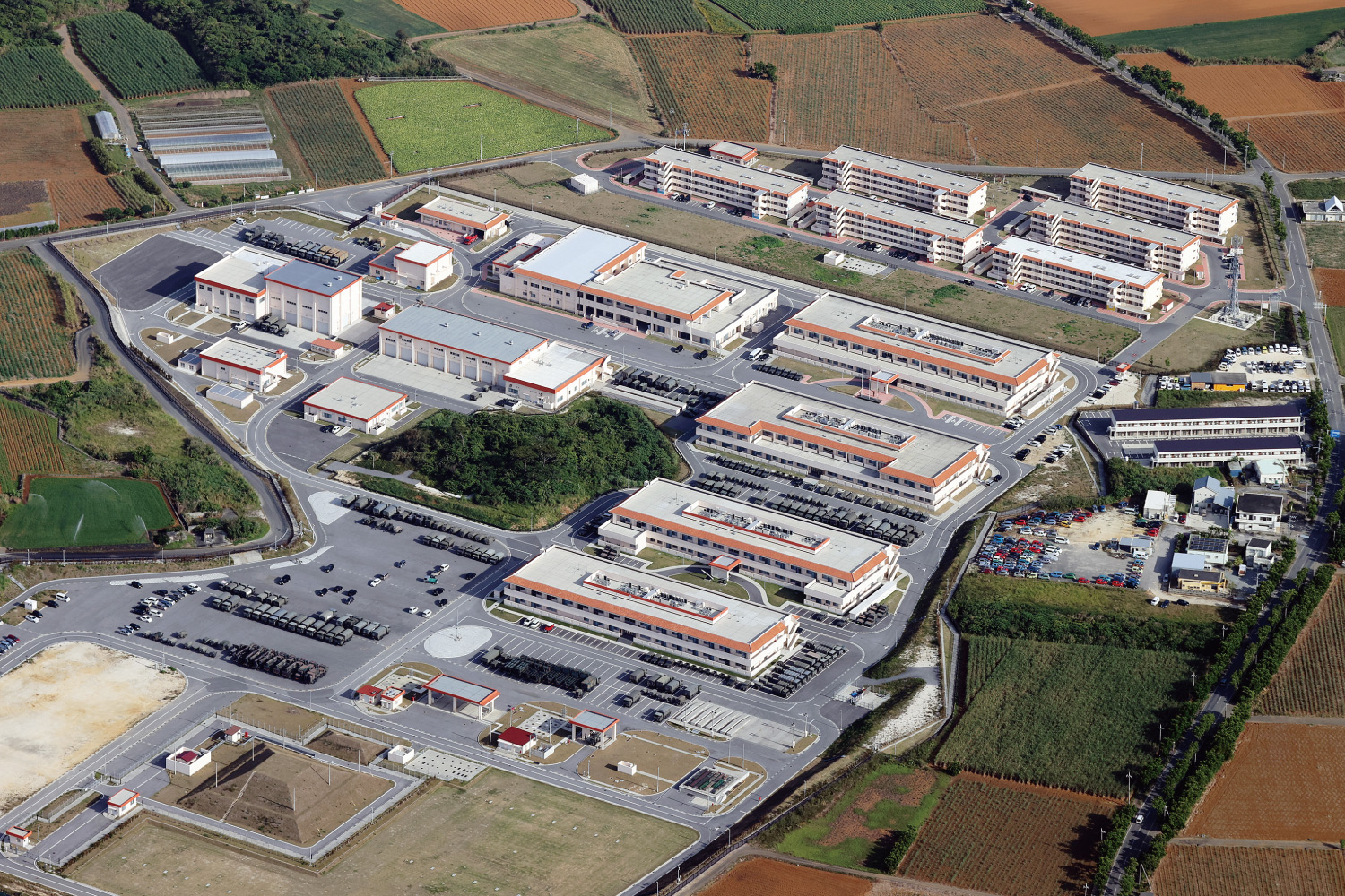 島の中央に位置する宮古島駐屯地。写真右上のエリアが官舎になっており自衛隊員とその家族が暮らしている(JIJI)23年4月から宮古警備隊長兼宮古島駐屯地司令を務める比嘉隼人氏は「尖閣諸島まで約200キロ・メートルという物理的な近さもあり、南西地域で起きる事象一つひとつが『対岸の火事』ではないと感じている。我々には有事の際の初動の部隊だという緊張感がある」と話す。