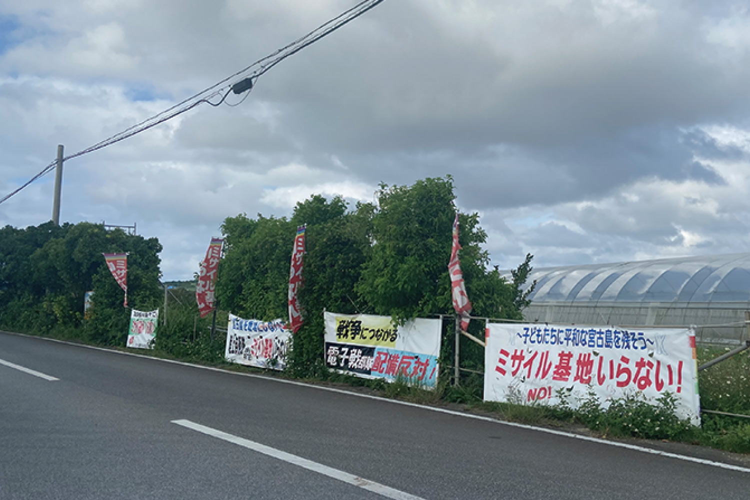 一方で市民団体による抗議活動は今もなお続いている。駐屯地の正門前の路上には「ミサイル基地いらない!」「宮古島を戦場にしないで」などと書かれた横断幕やのぼり旗が並ぶ。駐屯地には官舎が隣接しており、幼児や小学校に通う児童もいる。隊員やその家族の心情を察すると、複雑な気持ちになる。