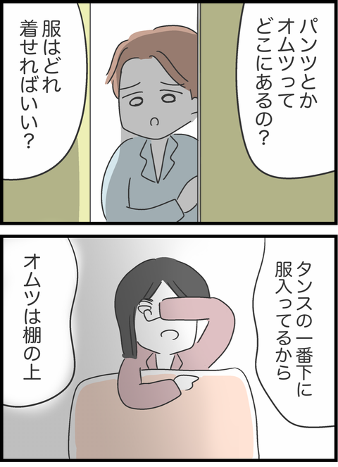 布団で横になっていると、パンツやオムツの場所、服は何を着せたらいいのか夫から質問責めにされるようこ。