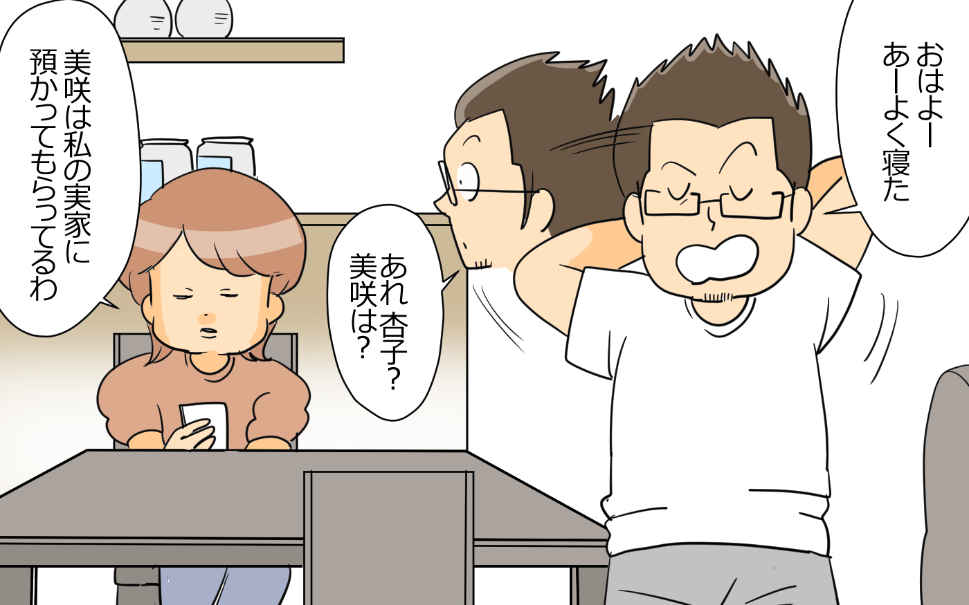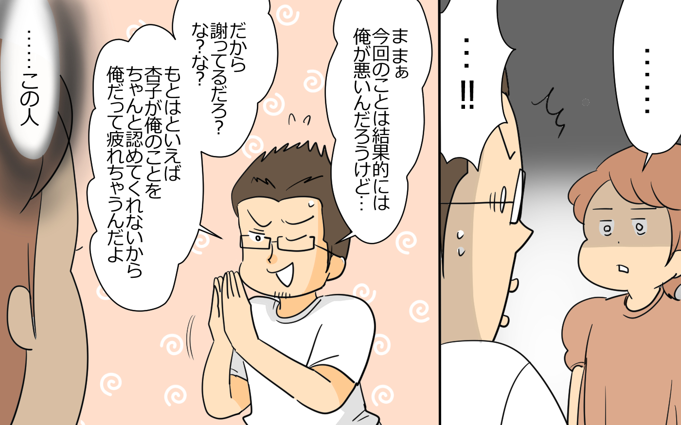 杏子の夫は約束を破っても「謝ったからいいだろう」「謝ったのに」と逆に杏子を説教して、反省がない。杏子や娘・美咲との約束を平気ですっぽかし、適当に謝って、またすっぽかすことの繰り返し。夫からもっと許す心を持つようにと言われて、自分の頭が固いのかと納得しかけた杏子だが、「謝ったからご褒美がほしい」と言われ、あきれ果てる。もともとふたりは同じ職場で、杏子は夫の謝罪を受け入れるおおらかなところに惹かれたが、単に口だけ男だったことが結婚後にわかった。絶対に行くと約束していた娘の運動会も二日酔いで起きられない夫。疲れた顔で現れて、まるで杏子が鬼嫁かのように言って回るなど被害者ぶっている夫の態度に耐え兼ね、夜になってから杏子が注意すると、「運動会には間に合ったのだから、むしろ褒めろ」と開き直られ、心の距離を取るように。