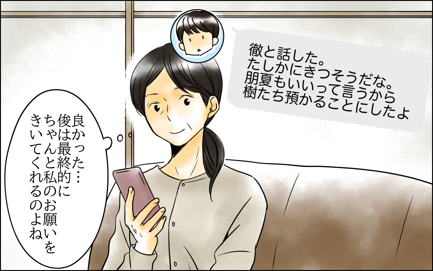 次男嫁の出産に伴い上の子の面倒を長男嫁に頼もうと画策する姑の葉子。長男嫁の朋夏に依頼したはずが、息子の俊から断りの連絡が入る。わざわざ息子を使って断ろうとする朋夏に対してイライラする葉子。しかしそんな葉子に対して俊は怒りをぶつけてきて…。