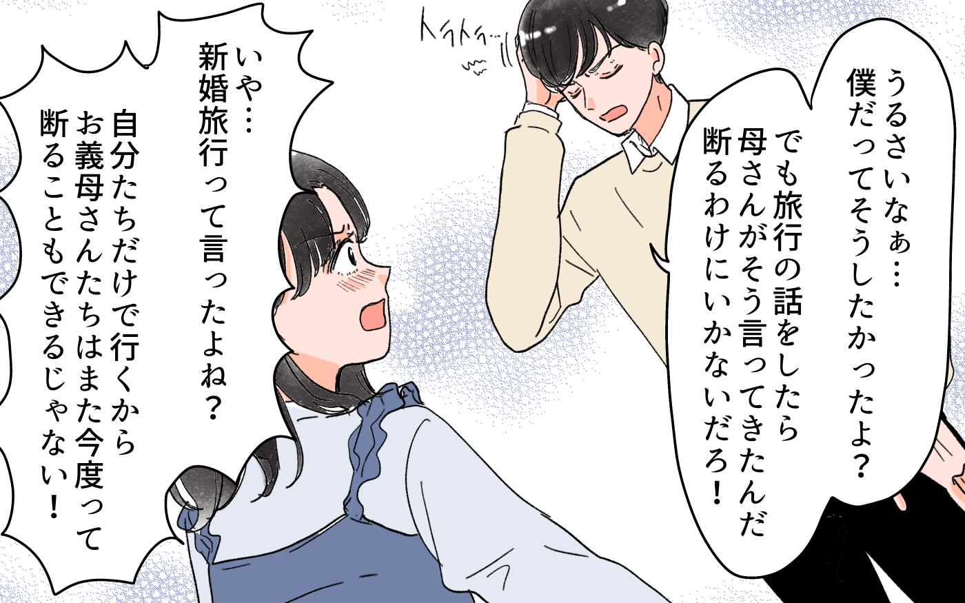 しかし夫はそれを義両親に話してしまったらしく、義両親も一緒に旅行に行くことを提案されてしまいました。