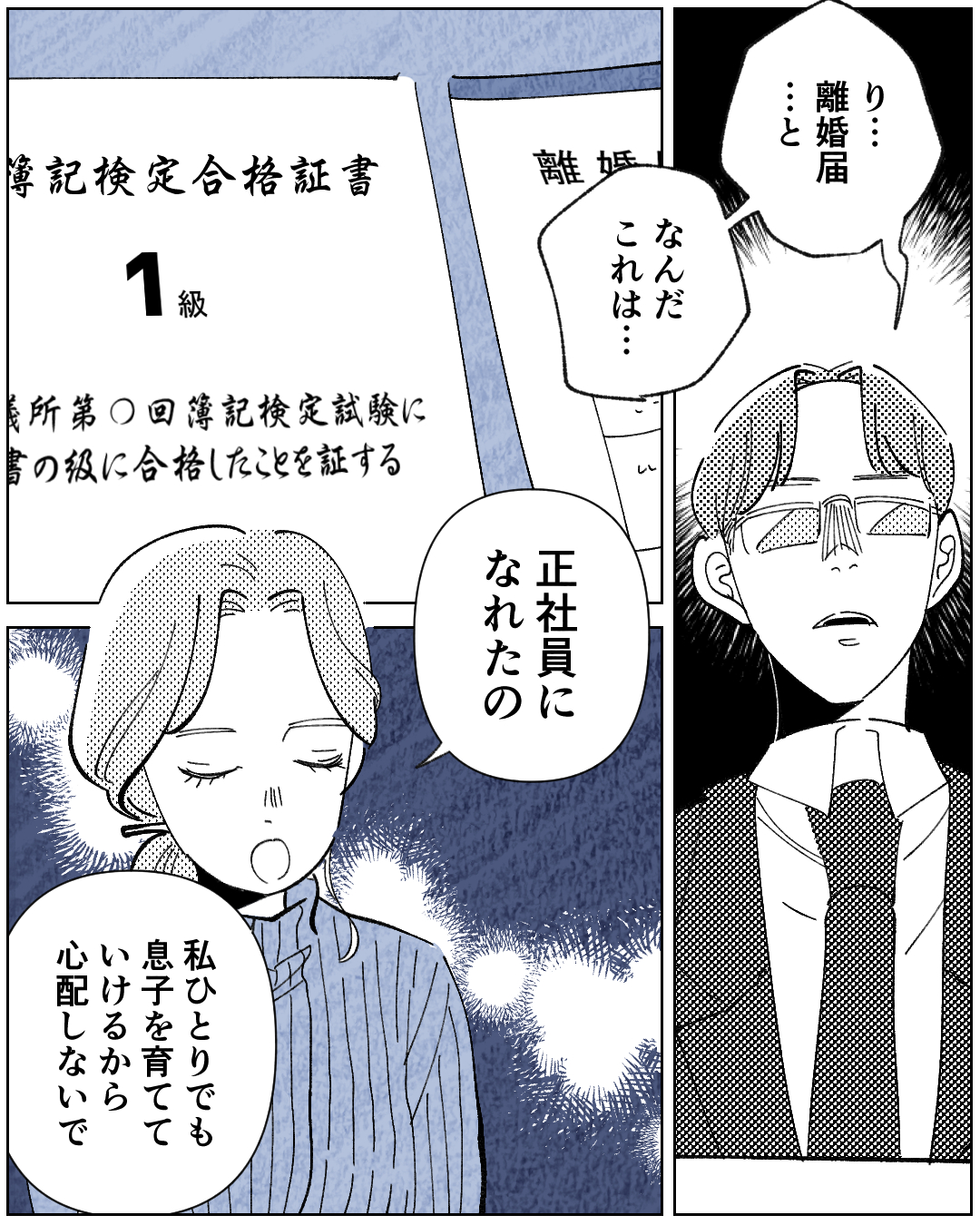 離婚届を突き付けると同時に私は、資格をとって正社員になったこと、私と息子の人生に夫はもう必要ないことを告げました。
