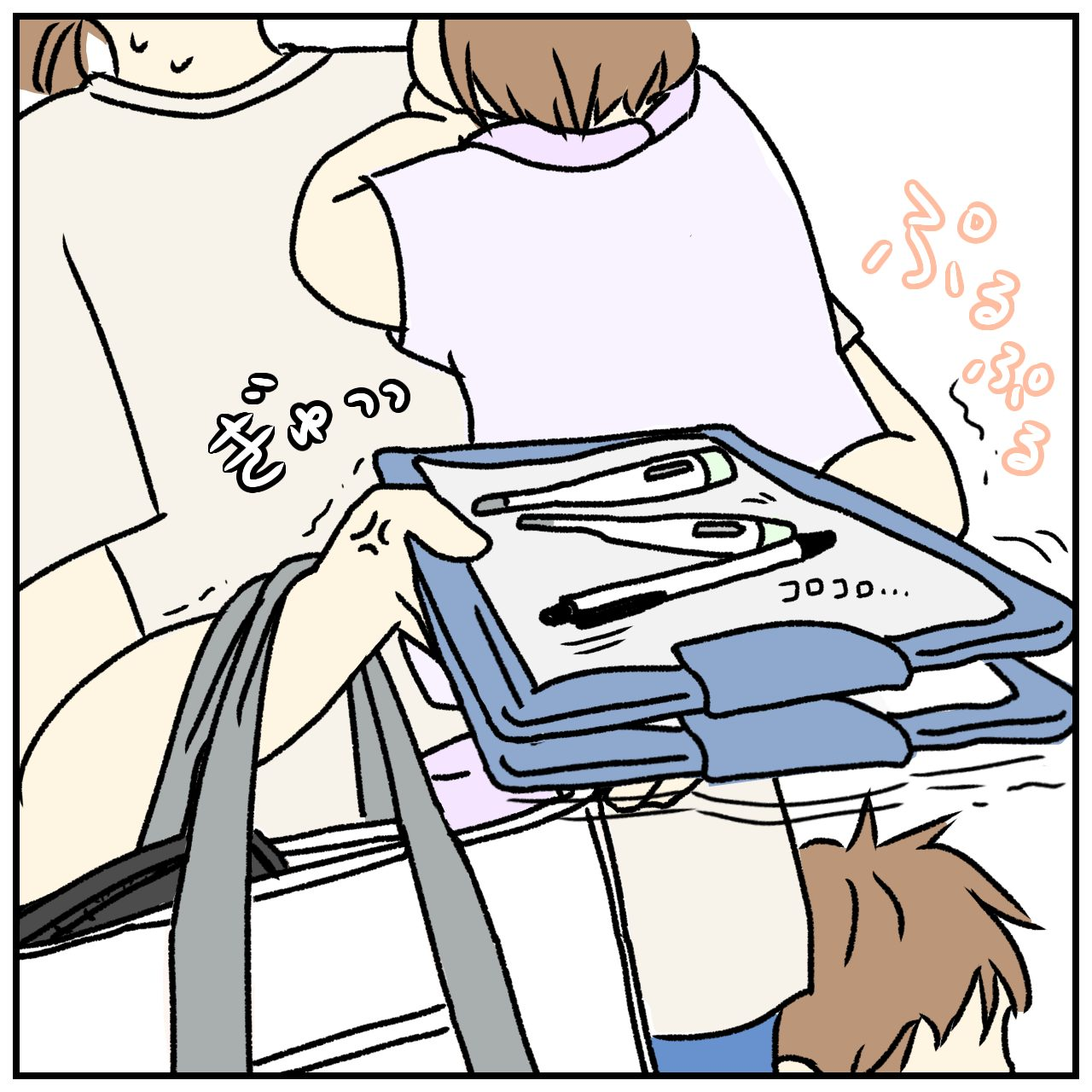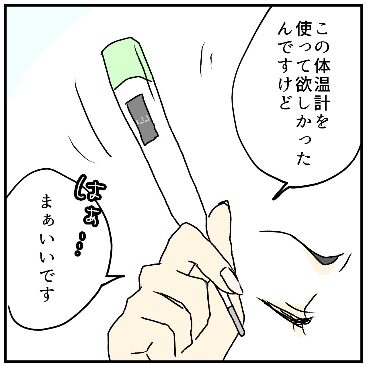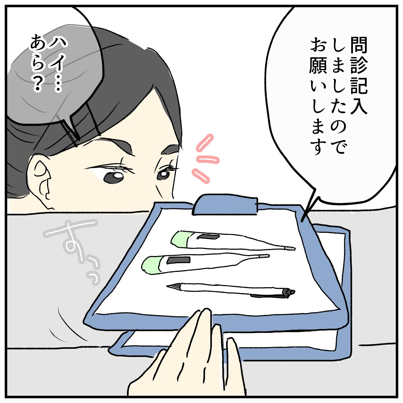 どうにか座って2人分の問診票を書けるようになったぴんさんですが、受付の人にもらった体温計では、子どもたちの熱が上手く測れませんでした。そこで、持参した体温計を使いましたが……。