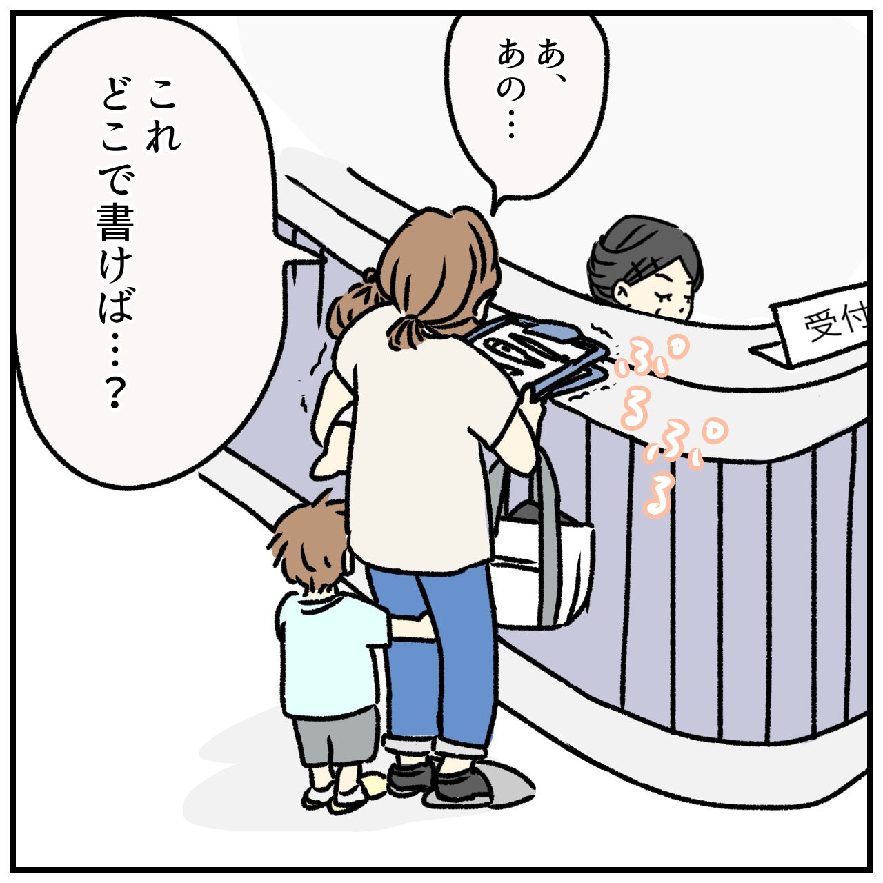 小児科に着いたはいいものの、待合スペースは親子であふれており、座りながら問診票を書く場所はありませんでした。しかし、小児科の受付の人は冷ややかな対応しかしてくれず。