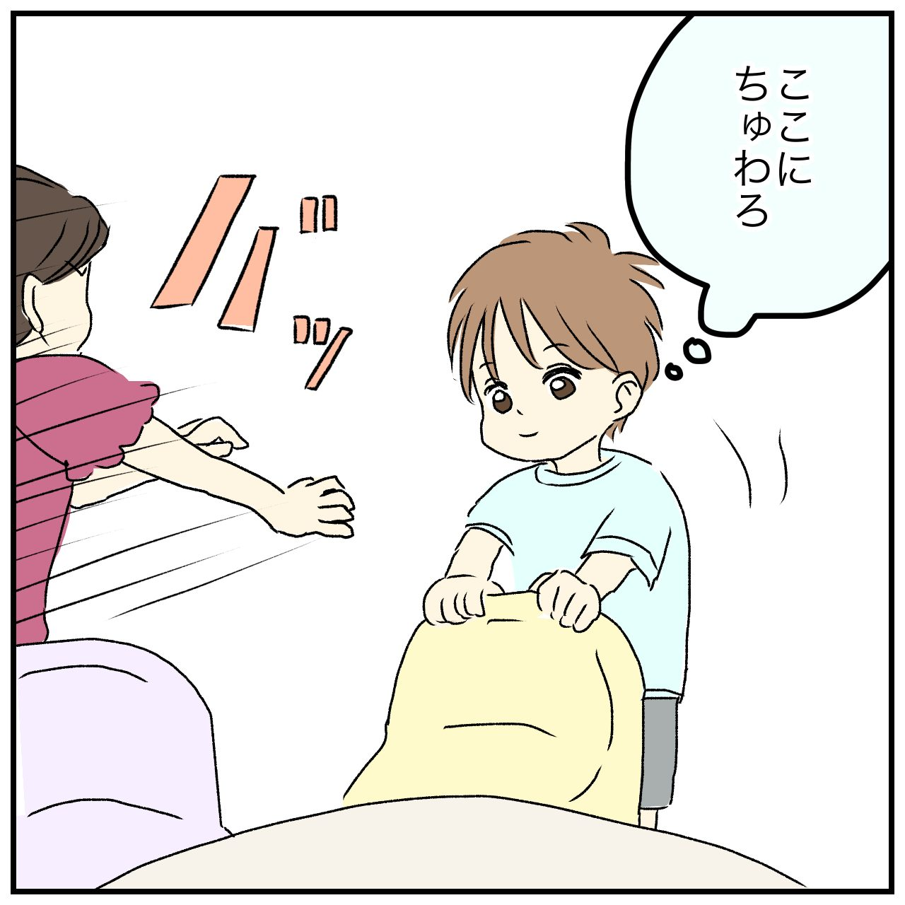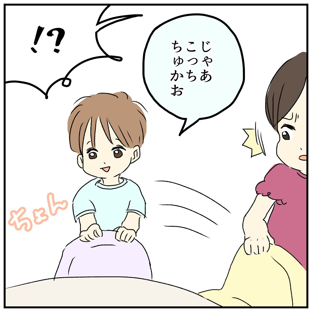 待合スペースで診察に呼ばれるのを待っていたぴんさんたちですが、いーくんはスペースに置いてある子ども用のイスに座ろうとします。ところが、急に女の子がやってきて……。