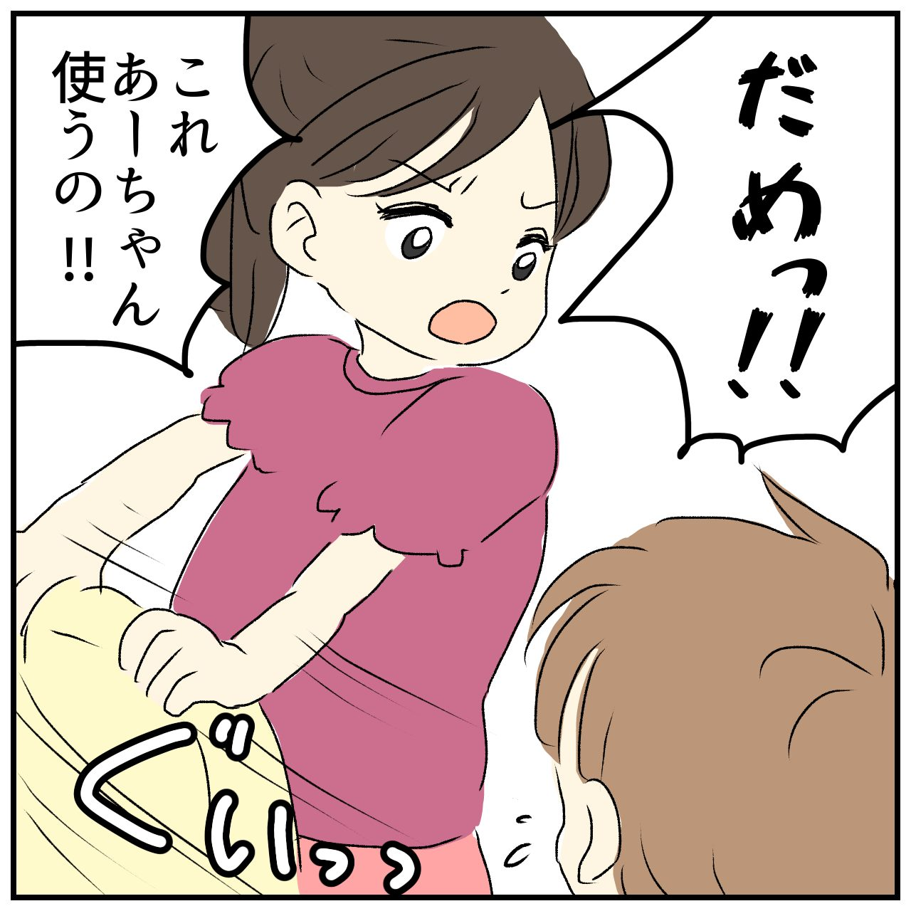 「これ、あーちゃん使うの!!」とイスを取り上げられたいーくんは、別のイスに手を伸ばします。