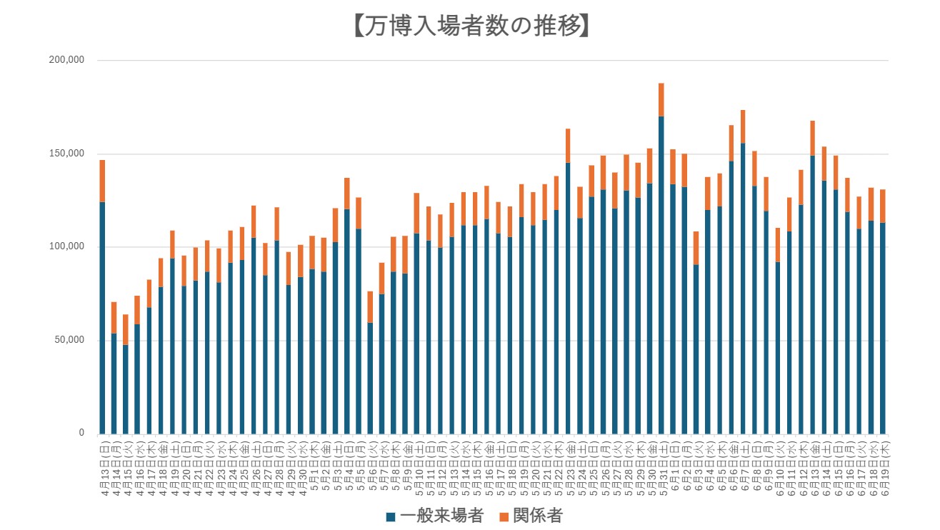 4月13日の開幕以降、一般来場者の累計は約719万人、関係者を含めた総来場者の累計は約849万人。最も1日あたりの来場者数が多かったのは5月31日(土)で、一般来場者数が16万9923人、関係者を含む総来場者数が18万7762人です。